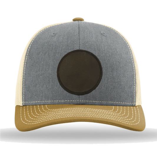 Heather Grey/ Birch/ Amber Gold Richardson Leather Patch Trucker Hat
