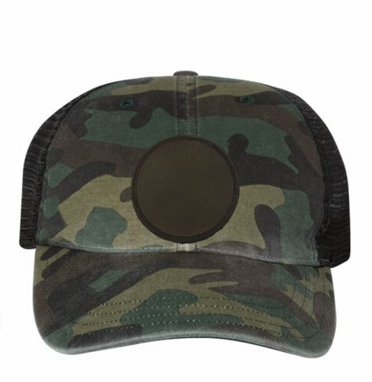Woodland Camo/ Black Yupoong Leather Patch Trucker Hat
